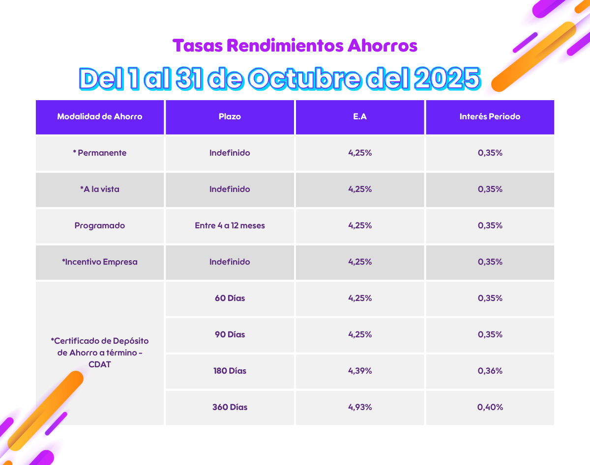 - Los rendimientos que obtendrás son mensuales sobre el ahorro permanente según lo establecido en el Reglamento de Ahorro y tus aportes sociales se revalorizan anualmente según disposiciones de la Asamblea.