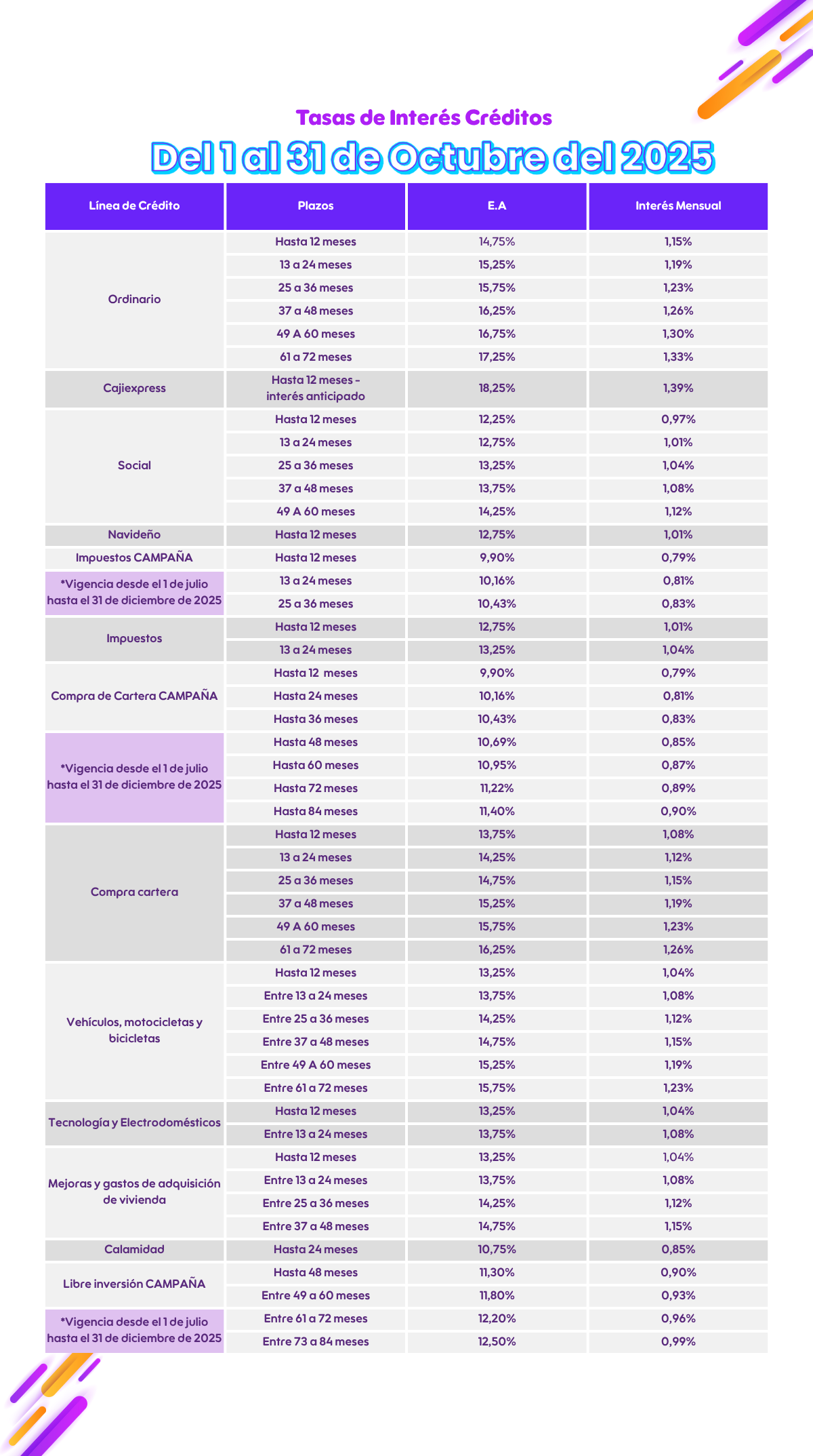 - Plazos hasta 72 meses y monto máximo de 144 SMLMV.